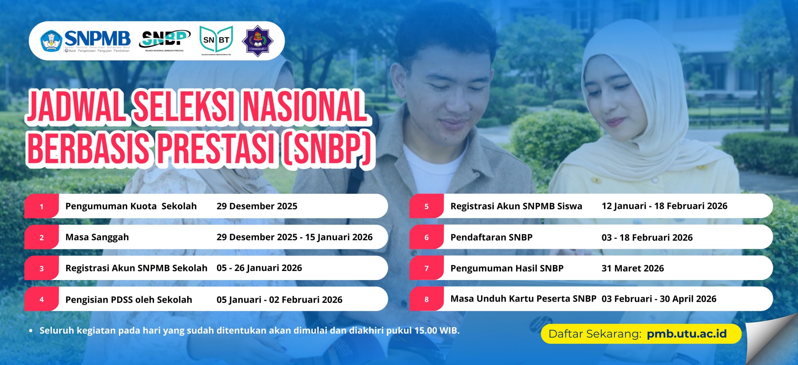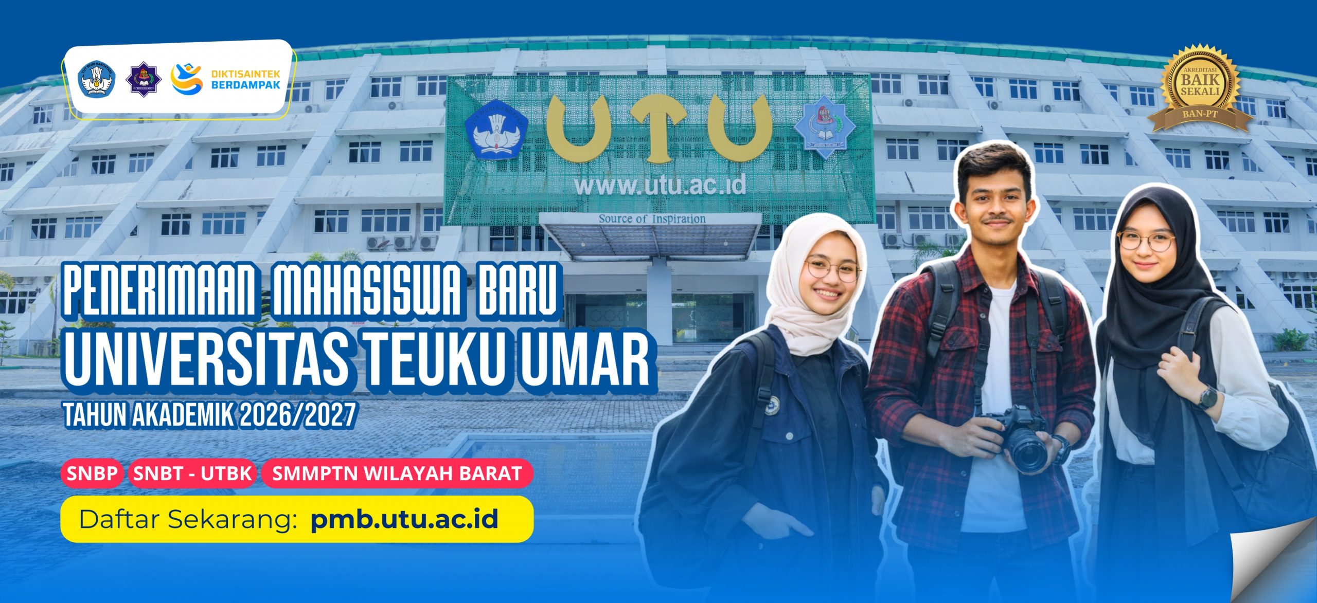 Universitas Teuku Umar (UTU) membuka Penerimaan Mahasiswa Baru Tahun Akademik 2026/2027 melalui berbagai jalur seleksi nasional dan wilayah, sebagai berikut: SNBP (Seleksi Nasional Berdasarkan Prestasi) SNBT–UTBK (Seleksi Nasional Berdasarkan Tes) SMMPTN Wilayah Barat UTU merupakan perguruan tinggi negeri yang berkomitmen menghasilkan lulusan unggul, berdaya saing, dan berkontribusi nyata bagi pembangunan daerah dan nasional, dengan dukungan program...Read More