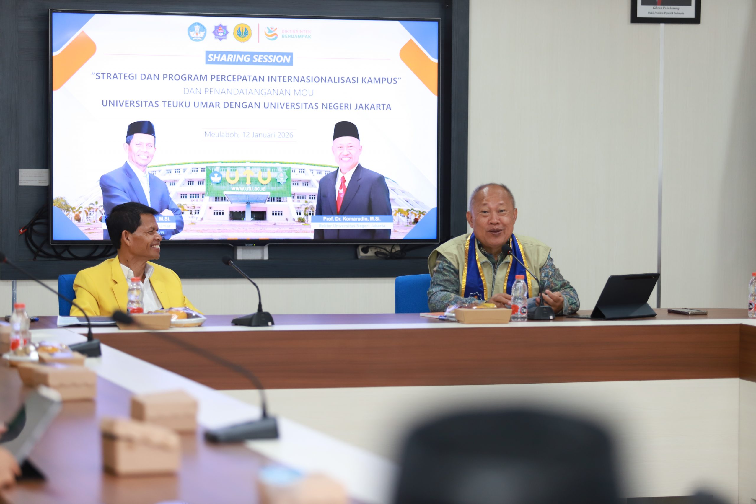 Meulaboh – UTU | Universitas Teuku Umar (UTU) menggelar kegiatan sharing session bertajuk “Strategi dan Program Percepatan Internasionalisasi Kampus” dengan menghadirkan Rektor Universitas Negeri Jakarta (UNJ), Prof. Dr. Komarudin, M.Si., sebagai narasumber utama. Kegiatan yang berlangsung di Ruang Rapat Senat, Gedung Kuliah Terintegrasi UTU, Senin (12/01/2026) ini dihadiri oleh jajaran pimpinan UTU mulai dari Rektor, para wakil rektor, dekan, kepala lembaga, kepala biro, kepala UPA, ketua jurusan, hingga tenaga kependidikan.