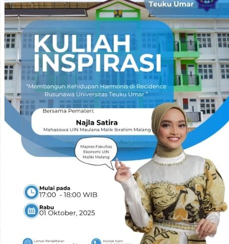 Meulaboh – UTU | Residence Rusunawa Universitas Teuku Umar (UTU) kembali menggelar Kuliah Inspirasi pada Rabu (1/10) dengan menghadirkan narasumber berprestasi, Najla Satira. Mahasiswi Manajemen dari Universitas Islam Negeri (UIN) Maulana Malik Ibrahim Malang tersebut memotivasi penghuni Rusunawa UTU untuk aktif mengukir prestasi dan memanfaatkan...Read More