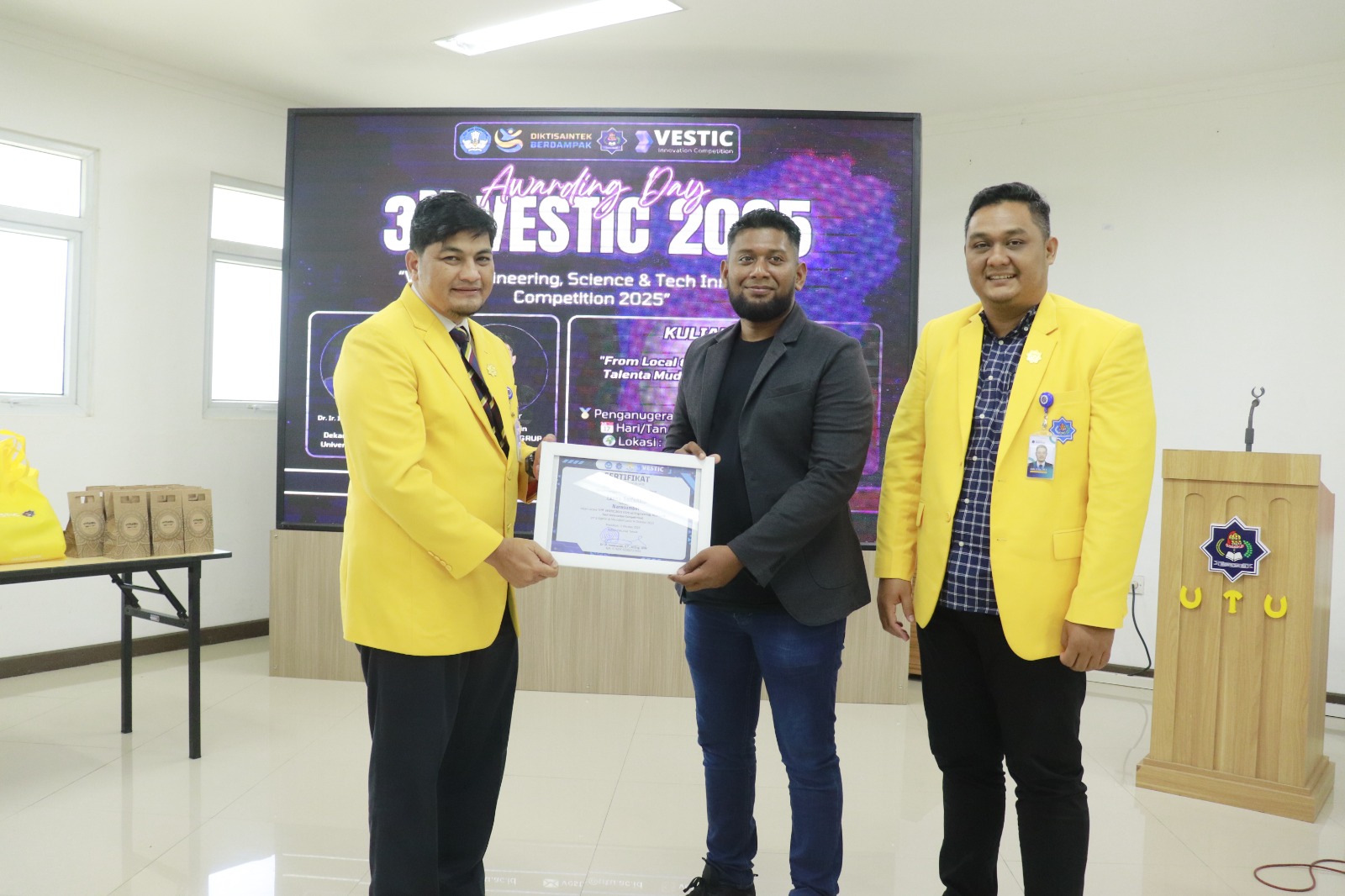 Meulaboh – UTU | Fakultas Teknik Universitas Teuku Umar (FT-UTU) sukses menyelenggarakan acara puncak The 3rd Virtual Engineering, Science & Technology Innovation Competition (VESTIC) 2025 pada Selasa (14/10). Acara ini menjadi puncak apresiasi bagi inovator muda tingkat SMA/MA/SMK sederajat di Aceh dan sekitarnya yang berkompetisi memperebutkan total hadiah senilai Rp10.000.000.