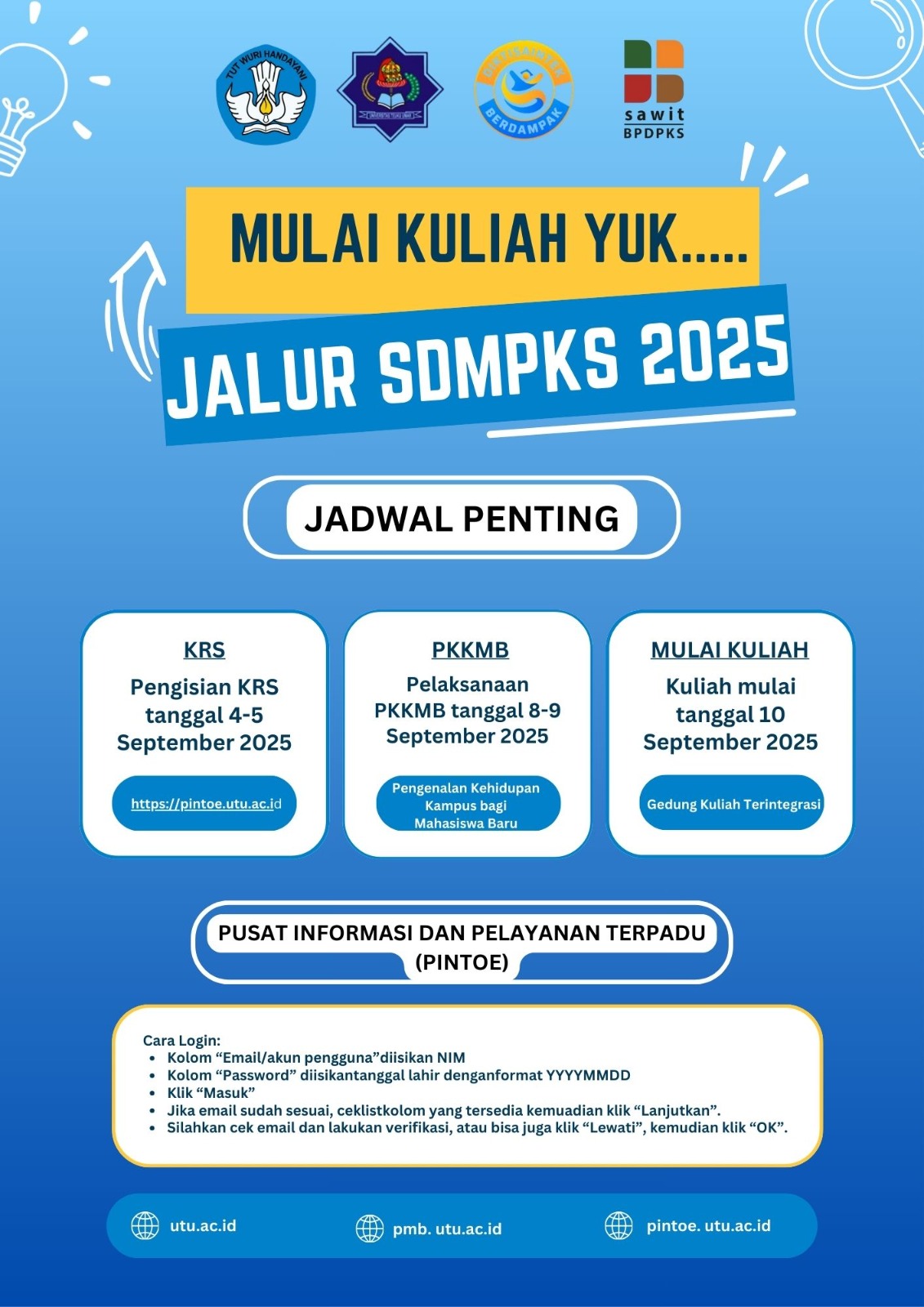 Kepada seluruh mahasiswa baru Jalur SDMPKS Tahun 2025, berikut adalah informasi penting terkait jadwal awal perkuliahan: