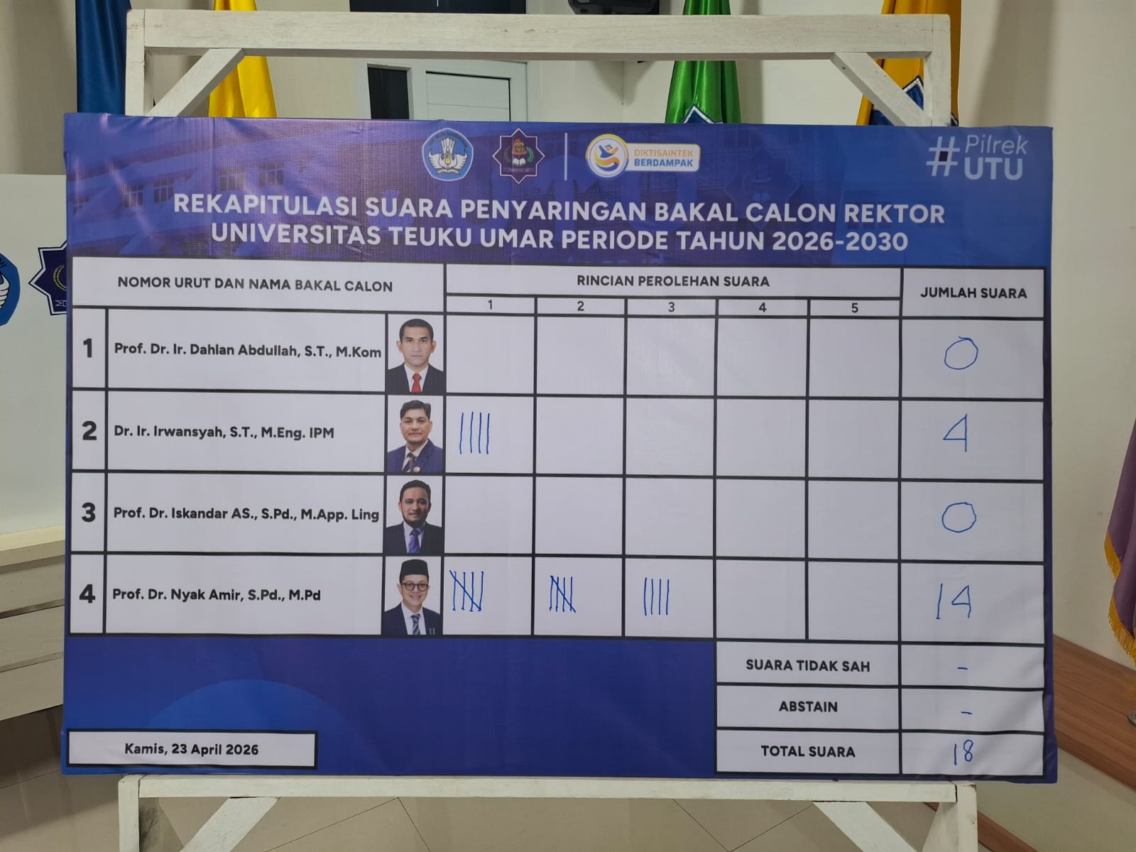 Pada pemungutan suara tahap pertama, Prof. Dr. Nyak Amir memimpin dengan perolehan 14 suara. Disusul oleh Dr. Ir. Irwansyah yang meraih 4 suara. Sementara itu, Prof. Dr. Ir. Dahlan Abdullah dan Prof. Dr. Iskandar AS sama-sama belum mendapatkan suara. Karena terdapat hasil imbang pada posisi ketiga, panitia melakukan pemungutan suara ulang khusus untuk kedua kandidat tersebut sesuai dengan ketentuan yang berlaku.