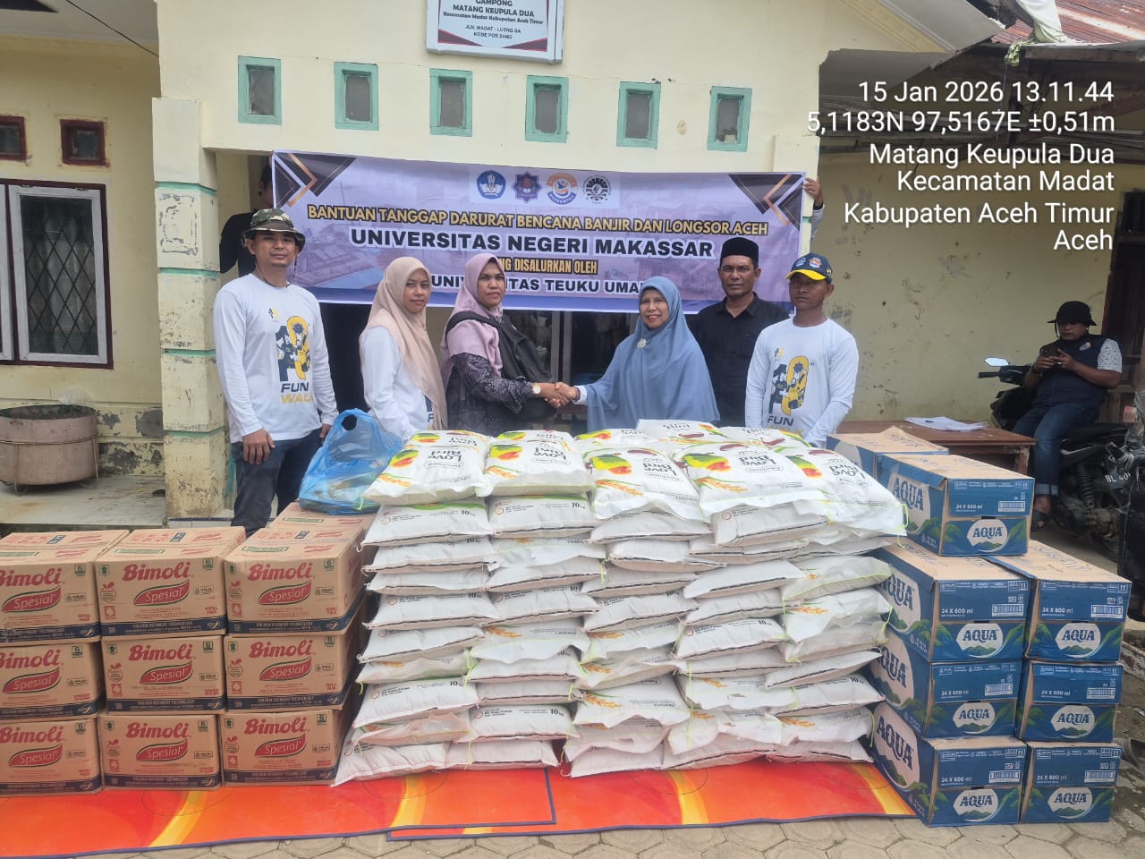 Penyaluran bantuan dipusatkan di Gampong Matang Keupula Dua, Kecamatan Madat, Kabupaten Aceh Timur, pada Jumat, 15 Januari 2026. Wilayah ini menjadi salah satu titik yang mengalami gangguan aktivitas sosial dan ekonomi cukup parah akibat rendaman banjir. Bantuan yang disalurkan meliputi kebutuhan pokok mendesak seperti beras, minyak goreng, dan air minum dalam kemasan.
